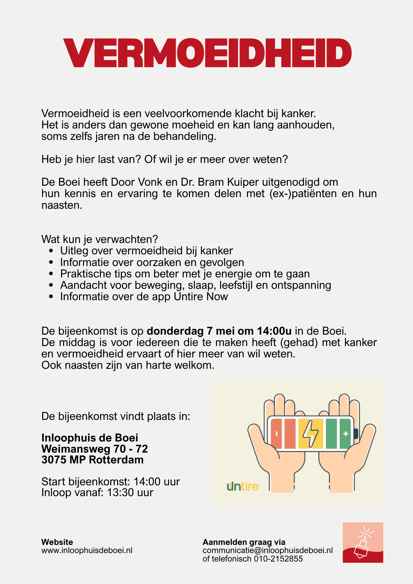 Loop je rond met vragen over kanker, of wil je juist even niet met ziek-zijn bezig zijn? Voel je je als mantelzorger overbelast? Valt het gemis je zwaar? In Inloophuis De Boei vind je steun en informatie. Bij vrijwilligers kun je terecht voor een luisterend oor en een gesprek. Je kunt je verhaal delen met lotgenoten waardoor je last lichter voelt. Of je haalt kracht uit creatieve en ontspannende activiteiten zoals Pilates, massage en tekenen & schilderen. De koffie staat klaar en 2 keer in de week wordt er een heerlijke, warme lunch geserveerd!